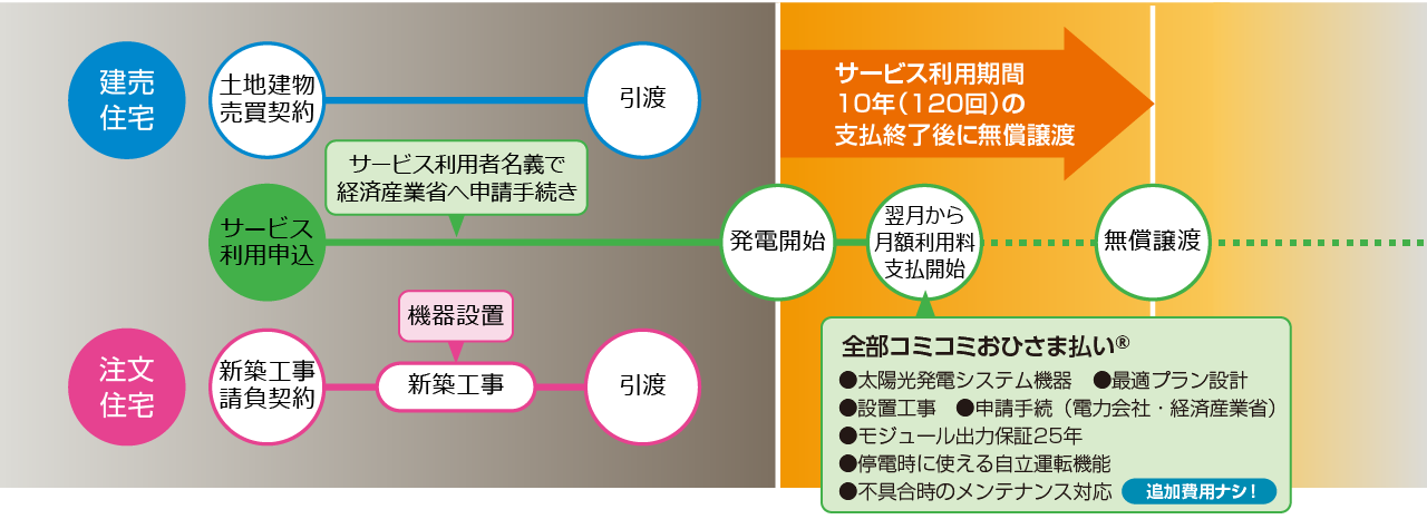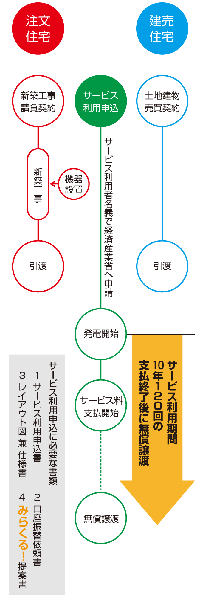 サービス利用期間終了後には、太陽光発電システムをサービス提供者からサービス利用者に無償譲渡。継続して発電生活をお送りいただけます。固定価格買取制度の定める売電期間は10年。以後の余剰売電は、電力市場の中で自由に取引きされることになります。創った電気を家庭で使う自家消費は、変わらずご利用いただけます。10年後には余った電気を売るよりも、蓄電池に一度ためて自宅で使い切るというライフスタイルが一般的になっているかもしれません。