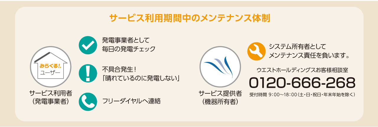 *発電しない期間が生じた場合に発電量の補償や補填はございません。不具合があった際は、速やかにご連絡をおねがいします。
